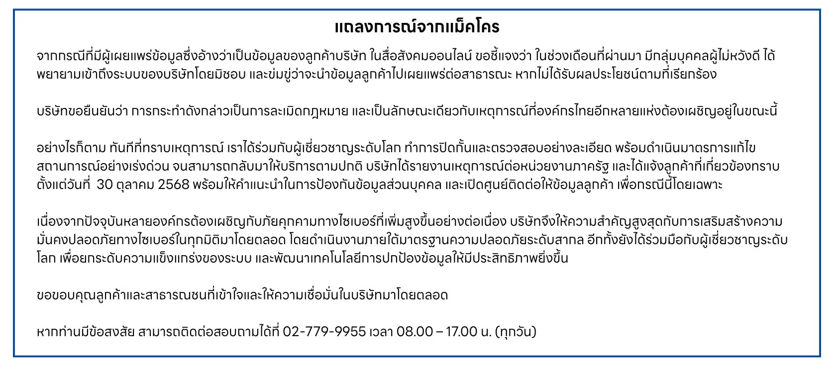เฉพาะแม็คโครฟูดเซอร์วิส สาขาป่าตอง, ราไวย์, เกาะพะงัน, พัทยาเหนือ, ละไม, กัลปพฤกษ์, บ้านเพ, ศรีนครินทร์ 2, เกาะช้าง, อ่าวนาง, กะรน, บางปู, วังหิน, อุดมสุข, รามคำแหง (สัมมากร), บดินทร์เดชา, ประชาอุทิศ, สุขุมวิท71, นวมินทร์70, ชะอำ, อ่อนนุช, สุขสวัสดิ์, ลาดกระบัง, นาทองเจริญ, รามคำแหง 24, อมตะนคร, บางคอแหลม, ขอนแก่น2, วงศกร 2, เหม่งจ๋าย, สุขุมวิท 22, ถนนจันทน์, ลำลูกกา, แพรกษา, ประดิษฐ์มนูธรรม, ตลาดรุ่งโรจน์, พงษ์เพชร,ตลาดวงศกร,ทองหล่อ,รามอินทรา กม.4, ชิโนพาร์ค
