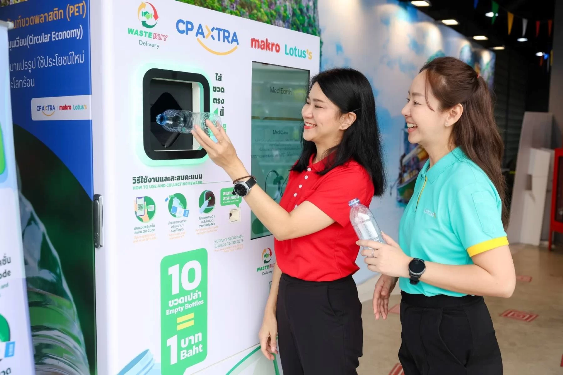 ส่วนโครงการ “RVM by CP AXTRA x Wastebuy” เครื่องรับคืนบรรจุภัณฑ์อัตโนมัติ (Reverse Vending Machine – RVM) ปัจจุบันติดตั้งที่แม็คโคร 5 สาขา ได้แก่ แม็คโคร สาทร, แม็คโคร ลาดพร้าว, แม็คโคร ศรีอยุธยา, แม็คโคร สามเสน และแม็คโคร จรัญสนิทวงศ์ เพื่ออำนวยความสะดวกให้ประชาชนสามารถนำขวดพลาสติกขนาดไม่เกิน 2 ลิตร มาส่งคืนได้ตลอดเวลา พร้อมรับคะแนนสะสมผ่านระบบดิจิทัล โดยขวดที่เก็บรวบรวมจะถูกนำเข้าสู่กระบวนการรีไซเคิลต่อเนื่อง ในอนาคตเตรียมขยายจุดให้บริการ “Weekend Recycle Market” และเครื่อง RVM ไปยังสาขาต่าง ๆ ทั่วประเทศ เพื่อกระตุ้นการแยกขยะและรีไซเคิลขวดพลาสติกอย่างต่อเนื่อง และสร้างแรงจูงใจให้ทุกคนร่วมเป็นส่วนหนึ่งของการดูแลสิ่งแวดล้อม